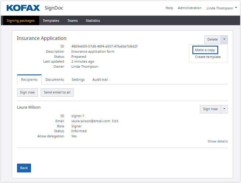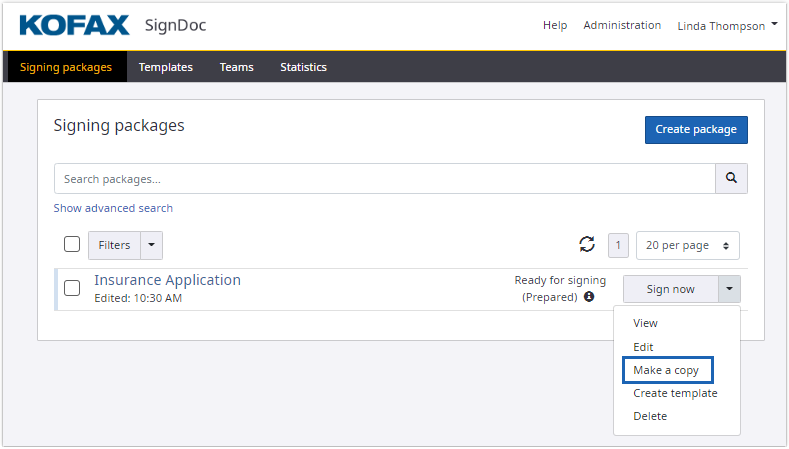 You may have a signing package that you would like to use again. In this situation, you can "make a copy" of the signing package as follows: