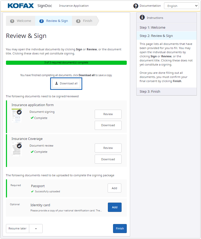 After you finish filling or reviewing all documents, click Download All to save all completed documents as a zip file.
