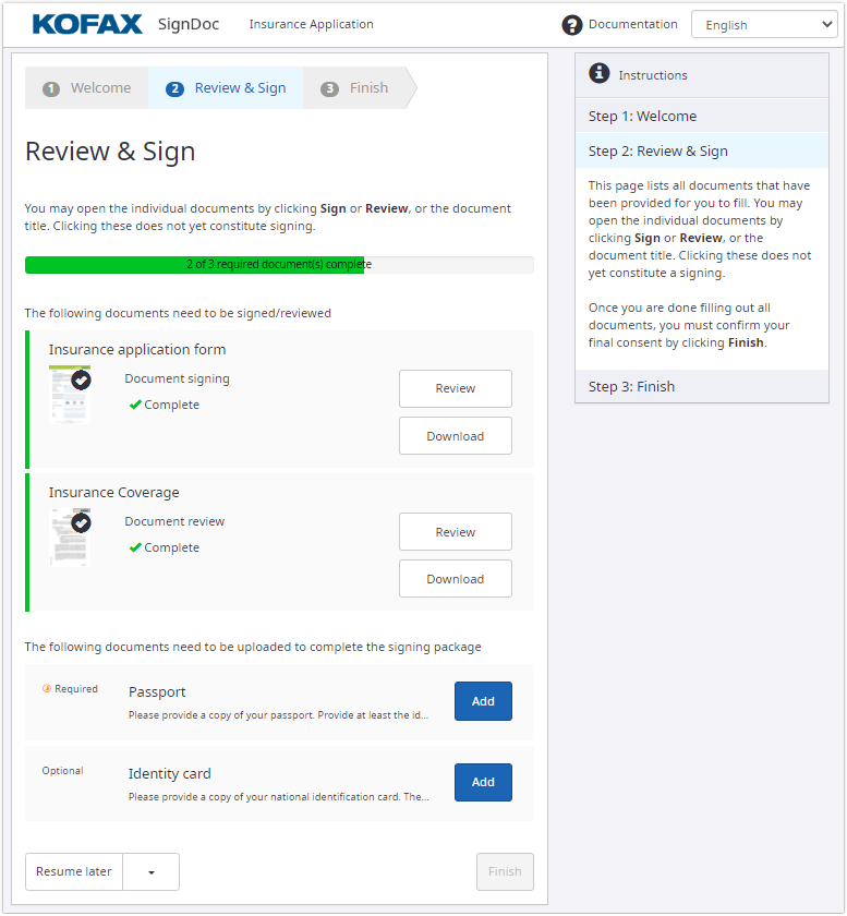 Click Finish if all required fields of all signer documents are completed and/or all documents have been reviewed by the reviewer. After users finish, they can no longer edit the documents in the package.
