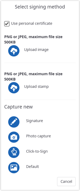 The following methods are available to sign a document: signature image, stamp image, signature, photo capture, or Click-to-Sign. When a TSP signature has been defined for a signature field. See TSP signatures in the signing process for a detailed description.