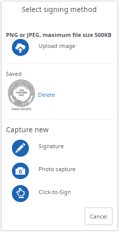The signature image is stored on the computer or device that you are working on. You can delete the stored image by clicking the Delete link.This method appears: