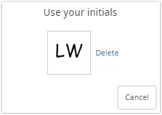 In the opened dialog, the initials can be re-used by clicking the corresponding tile. Clicking Delete will remove the stored initials and take the recipient back to the "Add your initials" dialog above. The last entered initials and style are preselected.