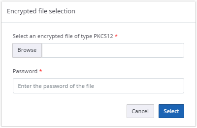 By clicking Select a dialog is displayed in which you can choose an encrypted file by clicking Browse and enter the password of the file.