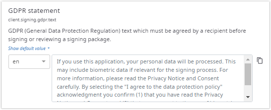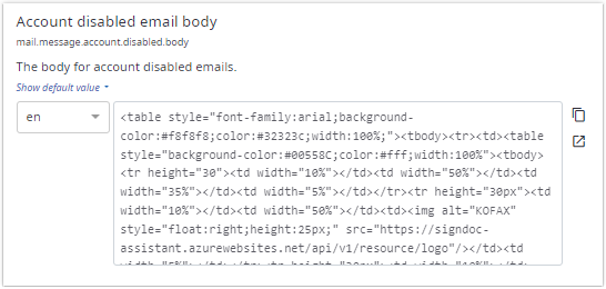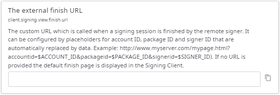 Use to enter a text or a number value for the current account. By entering a value for this account, the default value is overwritten. See Default values. To use the default value, you have to clear the text or the number of the input field. On the right there is an icon which copies the current value to the clipboard. This is useful when the current value is lengthy and handled better in an external text editor. Some of these text input elements are localizable. See Working with localizable strings.