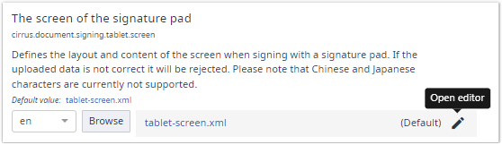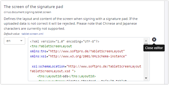 For xml files an inline XML editor is displayed when a user clicks the Open editor button. The XML editor supports auto-closing of XML tags, syntax highlighting and image preview (only available for specific settings).