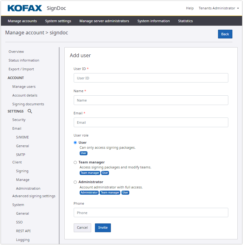 The SignDoc user ID fields accept alphanumeric characters and can also contain the underscore (_) and dash (-) characters. Starting with SignDoc 3.0, additionally the dot (.) character is supported.
