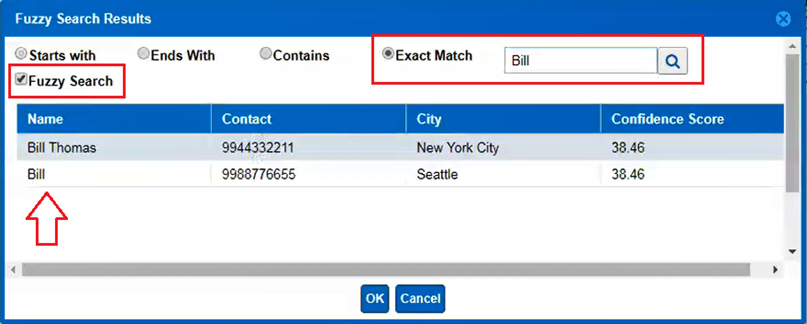 If the Fuzzy Search is selected, all results containing the word "Bill" are fetched.