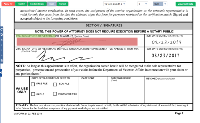 1. Drag and resize the key overlay (green) to the text or label that will serve as the key. In the following example, the key is the label "22A. SIGNATURE OF VETERAN".