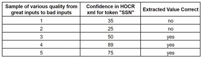 6. Using multiple real-world documents, determine the threshold for when values are extracted properly. See the following sample results for documents of various quality.