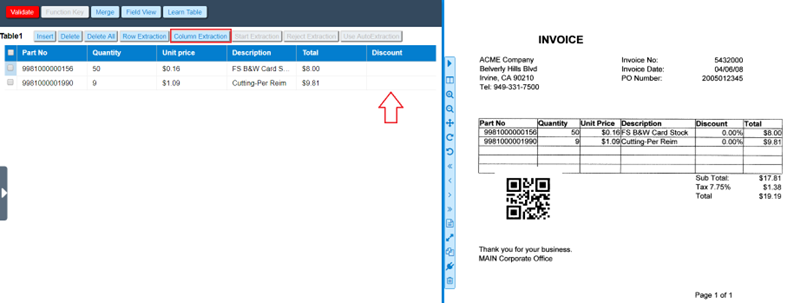 3. Extract data for the Discount column by using the Column Extraction option and click Learn Table.