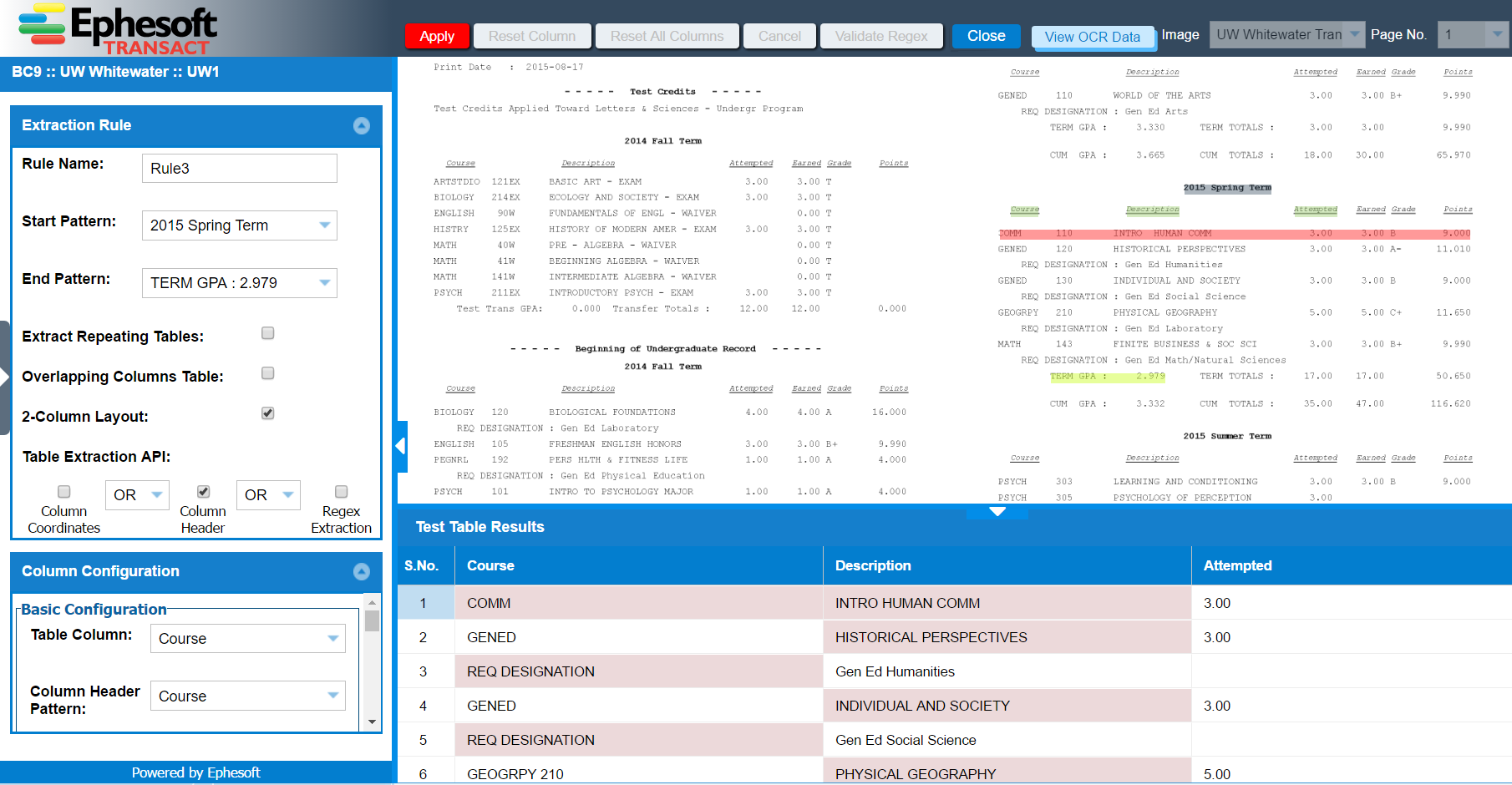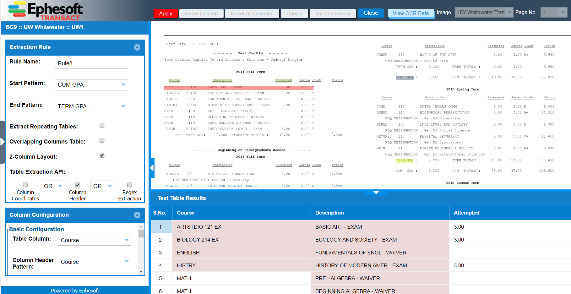 Click the Apply button to return to the Table Extraction Rules list. Here, select the rule and click the Test Table Extraction Rule button.