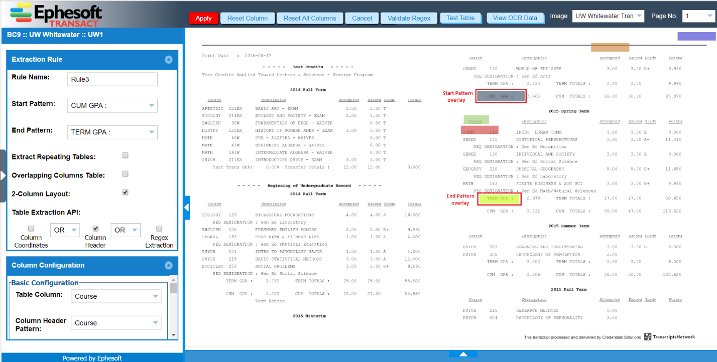 • To extract data from the table extending from the right column of the first page to the left column of the second page, place the Start Pattern overlay in the right column of the first page and use the corresponding overlays to specify Column Header/Data.