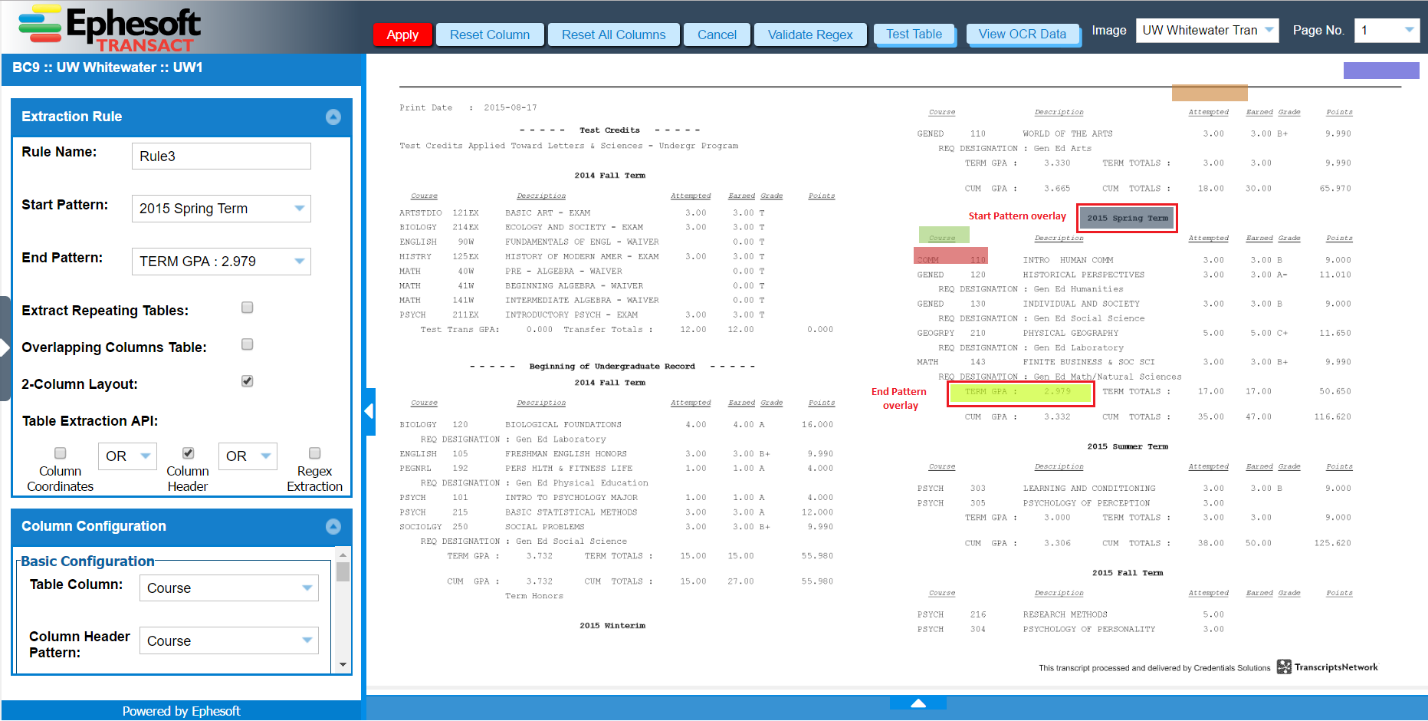 • To extract data from the table only in the right column, follow the same steps as described above, but in this case, place the Start and End Pattern overlays in the right-hand column. Click Test Table to see the values extracted only from the specified table area.
