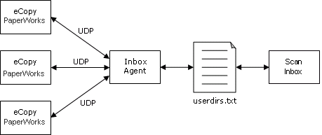 The eCopy Inbox Agent is a Windows Service that is installed with the ShareScan Manager. It uses the userdirs.txt file to provide eCopy PaperWorks with the path information that eCopy PaperWorks needs to connect to scan inboxes or network home directories. eCopy PaperWorks uses the UDP (User Datagram Protocol) to communicate with the Inbox Agent.